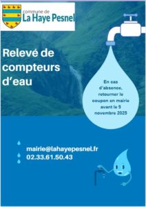 Les agents passent actuellement relever les compteurs d’eau – en cas d’absence, un coupon sera déposé dans votre boîte aux lettres – à retourner en mairie pour le 5 novembre 2025.